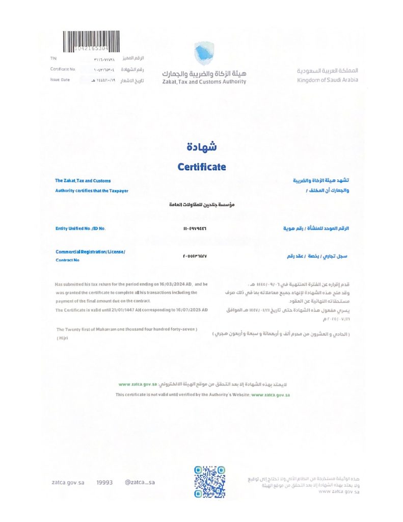 - Zakat, Tax & Customs Certificate – Issued by the Zakat, Tax, and Customs Authority in the Kingdom.