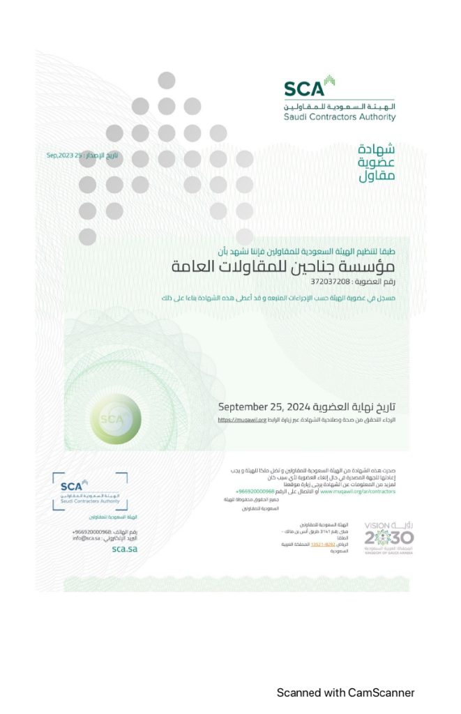 - Contractor Membership Certificate – Issued by the Saudi Contractors Authority (SCA).