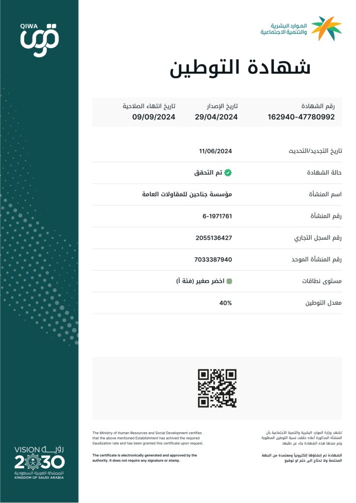 - Saudization Certificate – Certified by the Ministry of Human Resources, with a Saudization rate of 40%.
