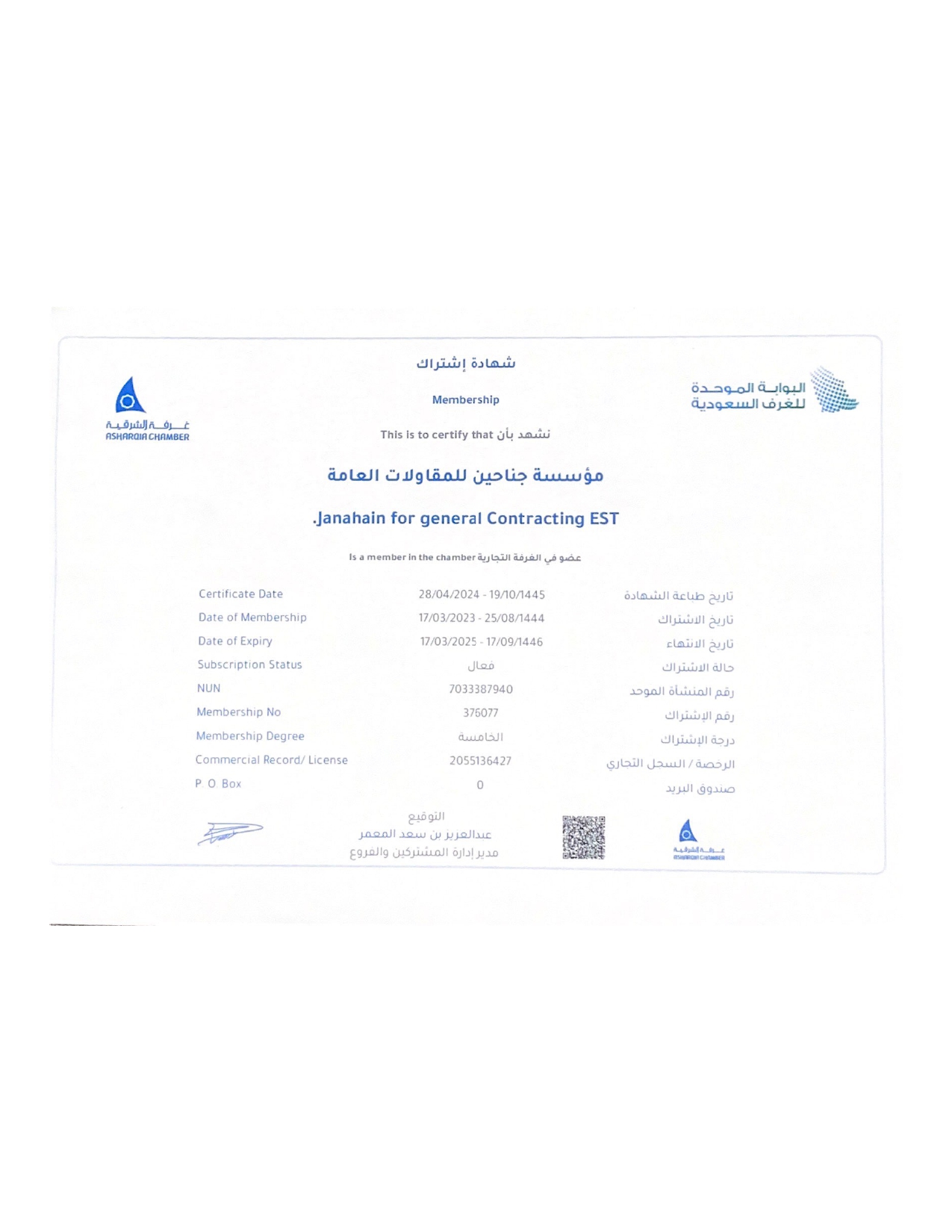 - Eastern Province Chamber of Commerce Membership – Certified membership from the Eastern Province Chamber of Commerce.